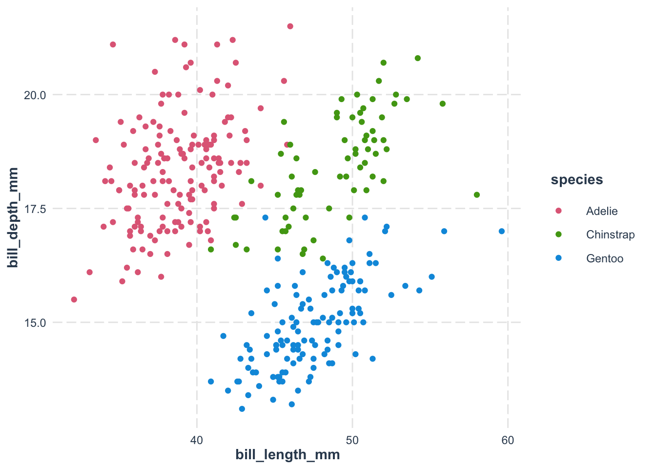 For example, consider the following code that uses colorspace to create a scatterplot of penguins data: