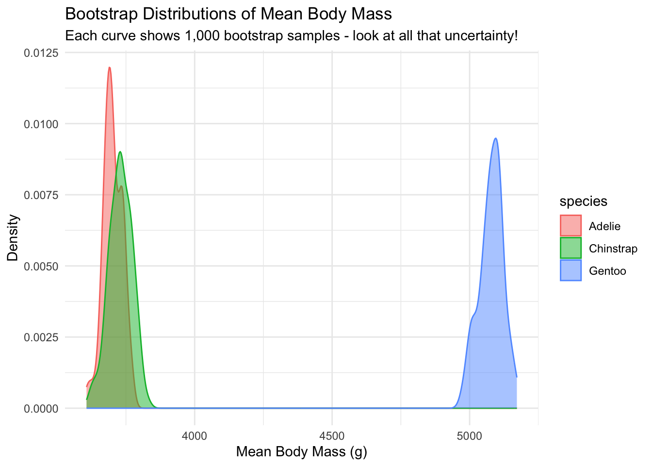 subtitle = "Each curve shows 1,000 bootstrap samples - look at all that uncertainty!",