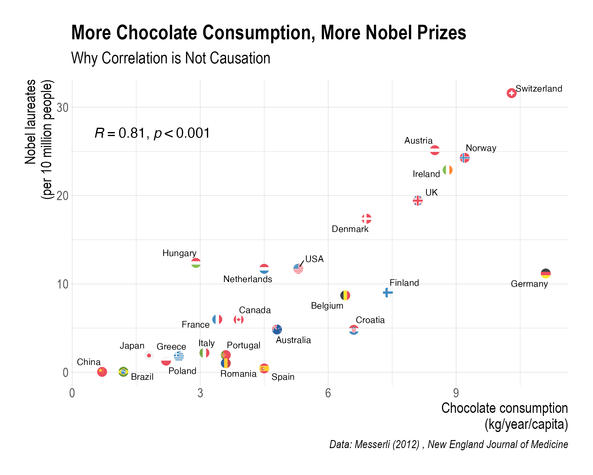 ggflags::geom_flag()to do this. TheFlagcolumn in the data contains the country codes. So it would be something likeggflags::geom_flag(aes(country = Flag)). - How to add a correlation coefficient to the plot? You can use the