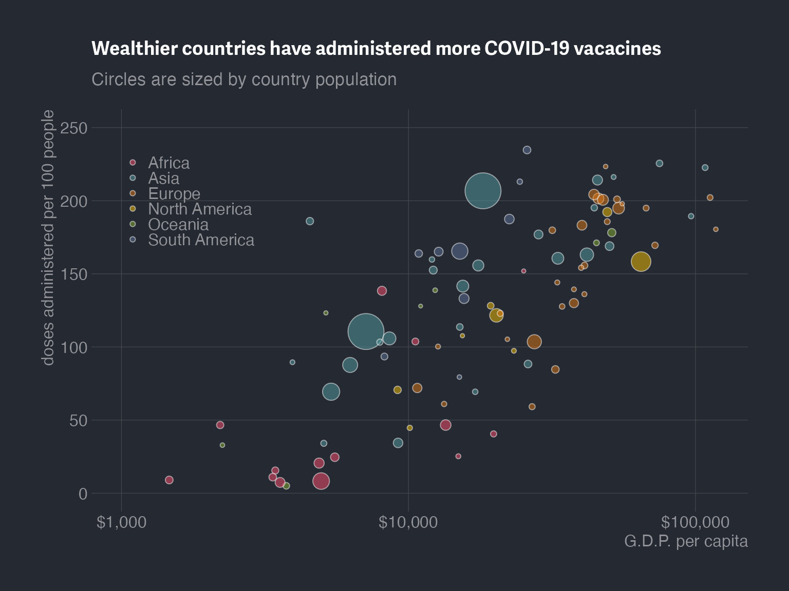 The New York Times often publishes elegant data visualizations. In this problem, we’ll mimic one of their COVID-19 vaccination rate vs. GDP charts. Their graph is below: